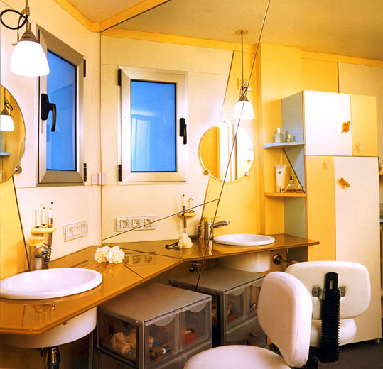 Yo reivindico el placer de sentarnos tranquilamente delante del espejo para arreglar nuestras manos, cejas, o simplemente charlar a gusto si compartimos el tiempo que estamos ahí con alguien. Por otra parte y sobre la colocación de lavabos a mayor altura, creo que , para un lavado de manos o un afeitado, es mejor elevarlo para que no nos obligue a agacharnos en exceso y así dañar nuestra espalda.