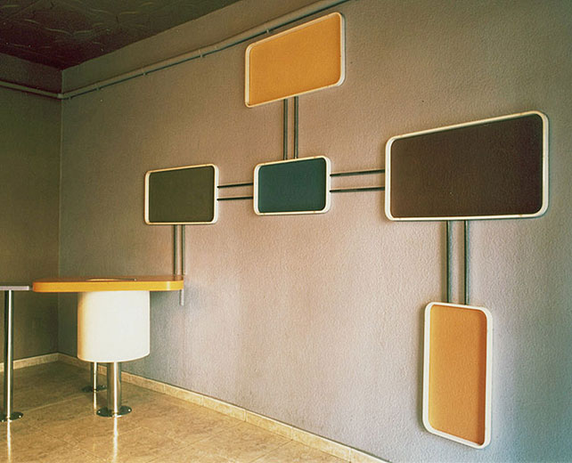 Mi cliente necesitaba rehabilitar este portal en las Ramblas, para poder alquilar un piso de oficinas en el edificio con el mínimo gasto. Lo único que podía aprovechar, era una pared revestida de baldosa colocada en los años 70, por lo tanto , di al espacio ese aire estético. Diseñé la mesa-buzón, necesaria para alojar el correo y jugué con el color fundamentalmente.