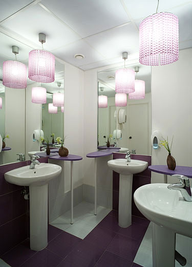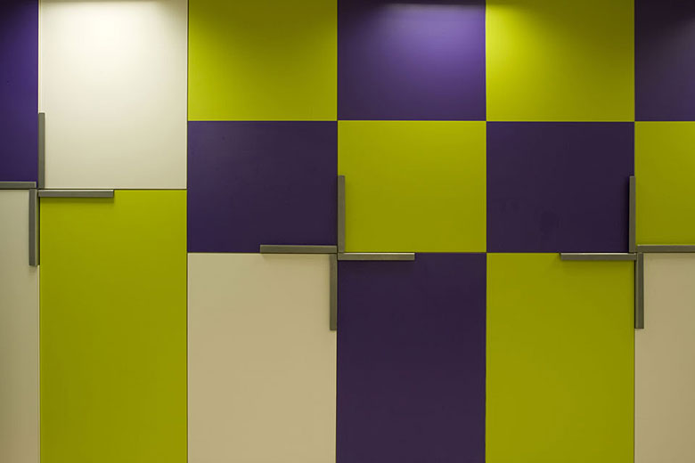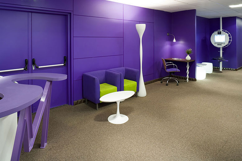 Los colores corporativos (morado y blanco) y el contraste de la cerámica cobre enriquecen este sencillo proyecto, reflejando las prioridades de mi cliente, rigor, creatividad e irreverencia.