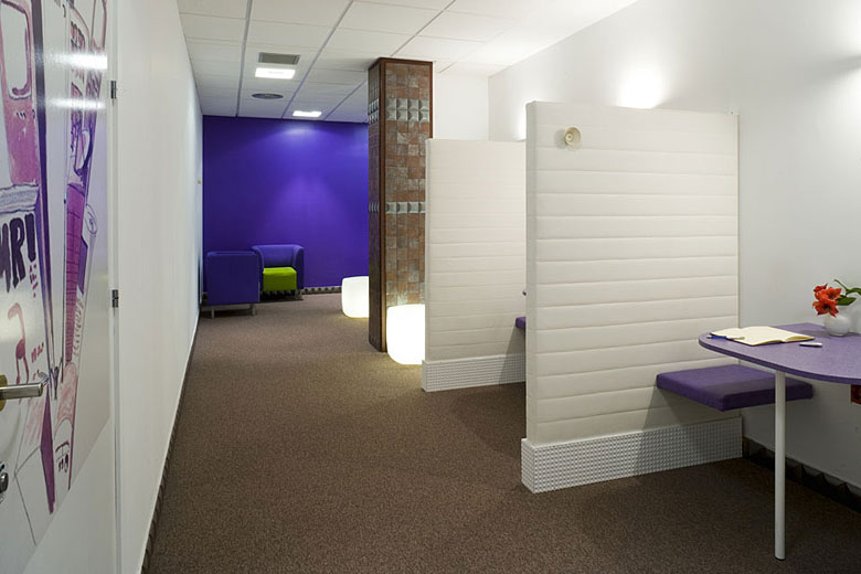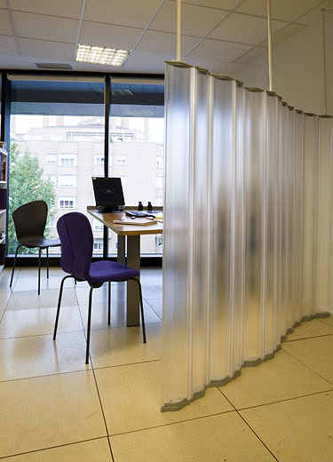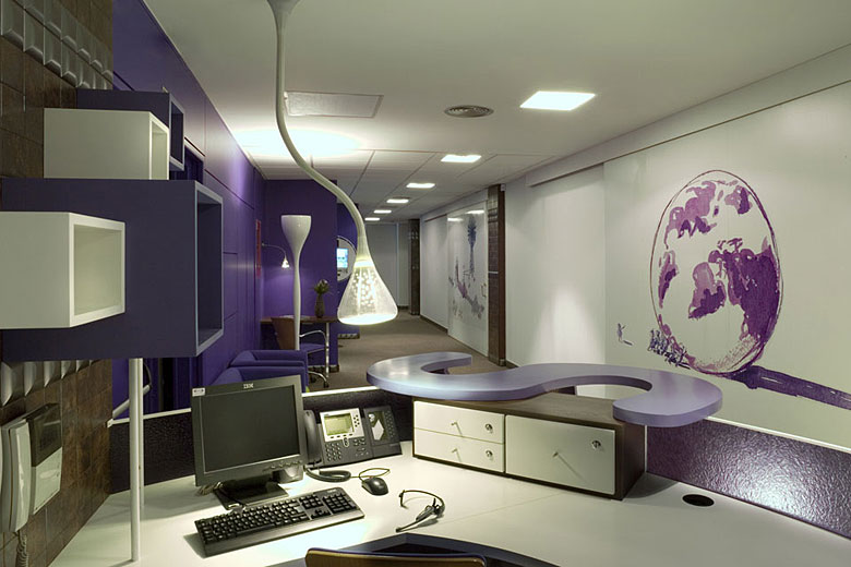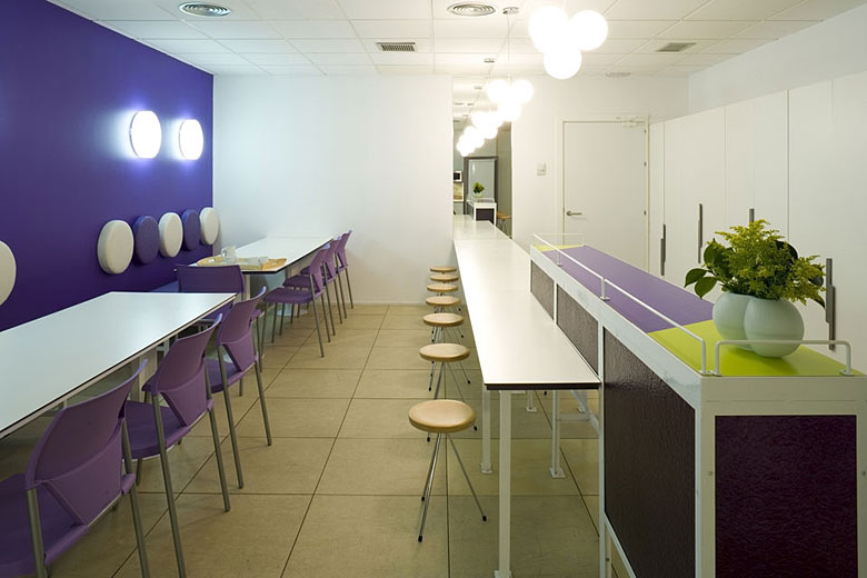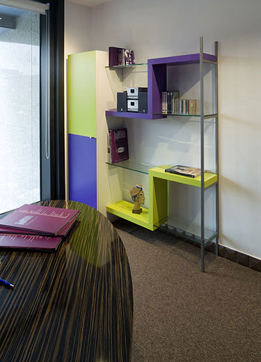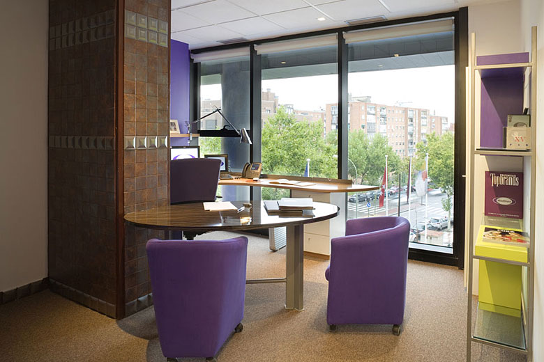 En ella, Lola Lago aprovechó muebles de la instalación anterior incorporando al proyecto cerámica trabajada manualmente. Quiso demostrar, una vez más que las oficinas no tienen porqué ser frías e impersonales y que es posible incorporar en ellas elementos fabricados para el hábitat.