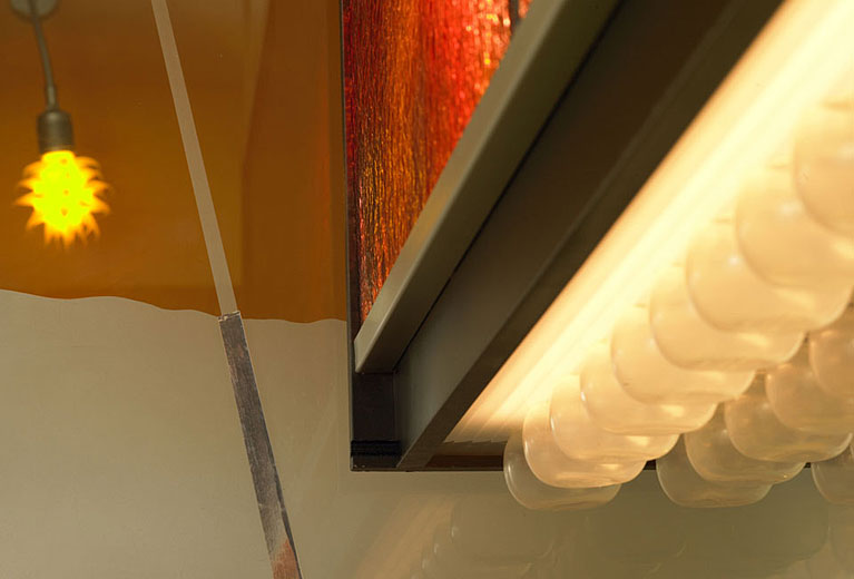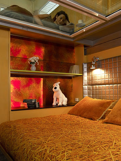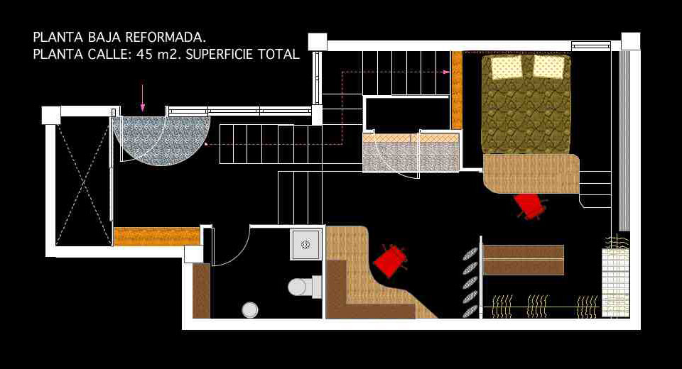 El local era un rectángulo vacío de 45 m2. en 3 niveles, mas un pequeño altillo con un aseo. No estaba construida ni la fachada. Así es que decidí ampliar el altillo y por debajo (planta baja 3er. nivel) utilizar la parte de menos cota como zona para dormir, respetando la altura de 2 mt. en un pequeño pasillo que a su vez se convierte en gran sofá en el espacio destinado a salón; en la fachada de ese pequeño pasillo hay una ventana para ventilación del dormitorio y una claraboya desde donde se recibe luz del piso superior (salón) y que se puede cerrar a través de unas cortinas enrollables opacas.