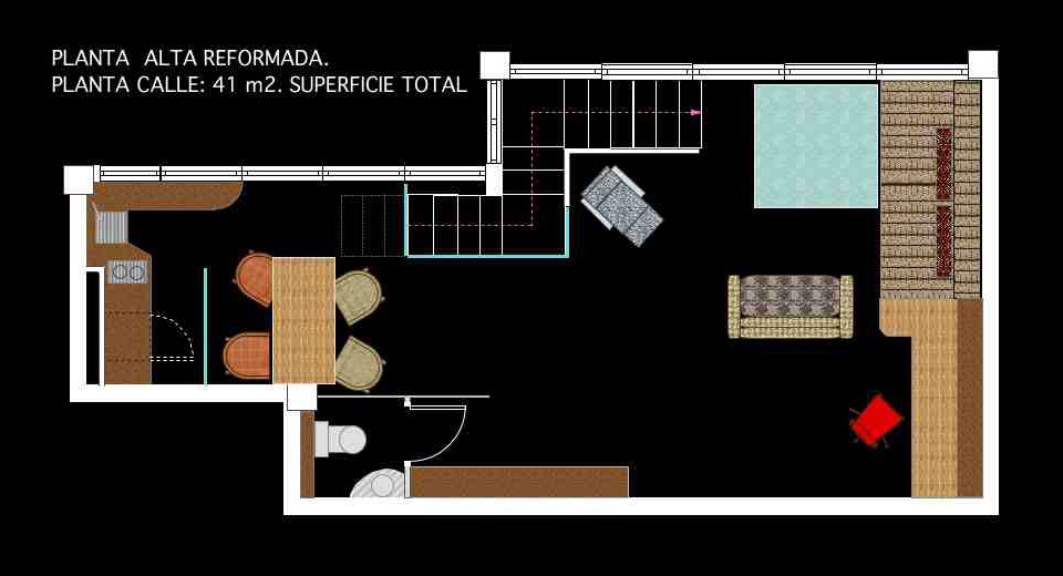 He situado la escalera en el paramento de la fachada para conseguir la mayor superficie de luz natural posible. En el piso superior he respetado el aseo existente pero derribando y sustituyendo el tabique opaco que había por uno de cristal. Una zona de trabajo, una de estar, otra de trabajo o de comedor y una de cocina componen los usos del piso superior de 35 m2. que he conseguido ampliando la zona de altillo. He reutilizado materiales que anteriormente han tenido otras aplicaciones, en diversos lugares de la intervención.