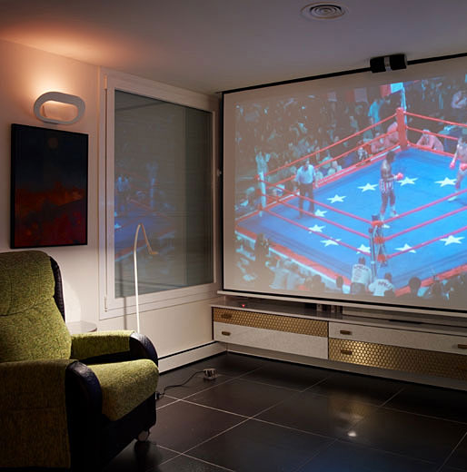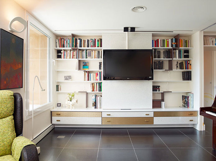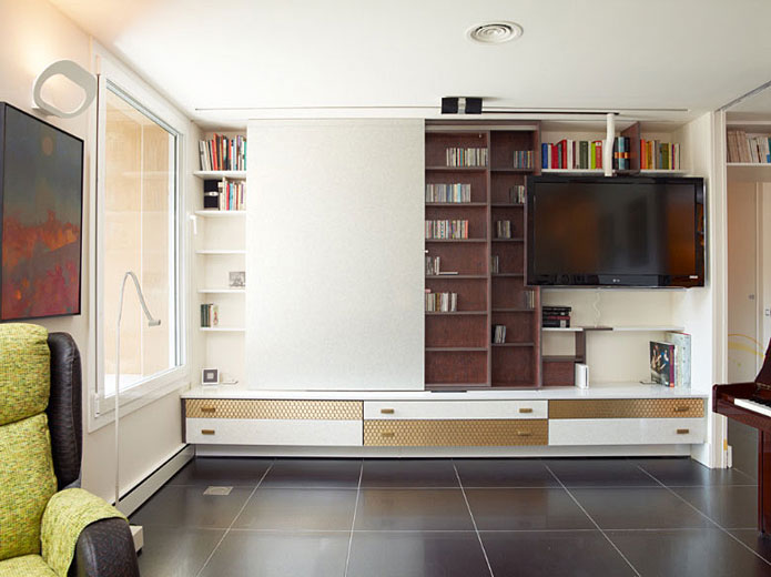 Realización de obra de arquitectura interior y diseño de mobiliario para la rehabilitación de un piso de 90 m2. Lola Lago vio claro que lo que sus clientes necesitaban, sobre todo, era poner orden y organizar espacios de almacenaje para todos los libros y objetos que sus clientes necesitaban guardar. Una pantalla de 220x 190 cm. cumplió el sueño de sus habitantes, tener un cine en casa. Todo es posible si uno no tiene miedo a cambiar las cosas.