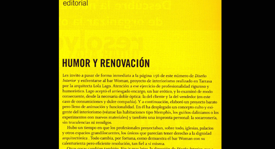 Primer servicio de "interiorismo democrático" por Internet que resuelve distribución de espacios interiores en viviendas o lugares de trabajo. La interiorista Lola Lago ha fundado la web interioresparatodos.com. La idea es que los clientes envíen por e-mail el plano de sus oficinas o casas y completen un cuestionario sobre sus necesidades y objetivos. Lago, desde 90 euros, responde con una reforma PARCIAL o desde 140 euros, a una TOTAL. La solución no es genérica sino personalizada incluyendo un informe detallado del porqué de sus propuestas