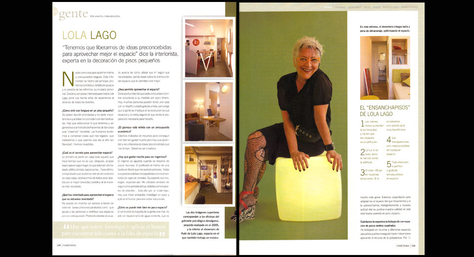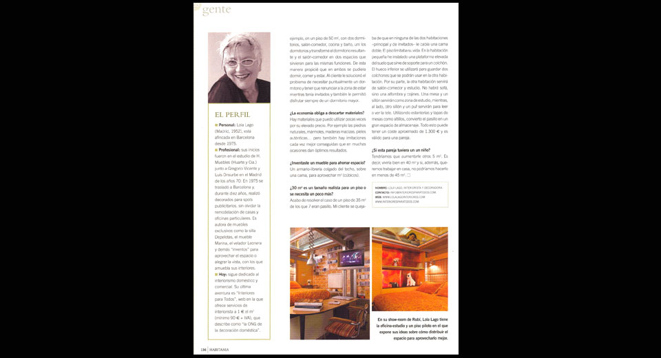 Primer servicio de "interiorismo democrático" por Internet que resuelve distribución de espacios interiores en viviendas o lugares de trabajo. La interiorista Lola Lago ha fundado la web interioresparatodos.com. La idea es que los clientes envíen por e-mail el plano de sus oficinas o casas y completen un cuestionario sobre sus necesidades y objetivos. Lago, desde 90 euros, responde con una reforma PARCIAL o desde 140 euros, a una TOTAL. La solución no es genérica sino personalizada incluyendo un informe detallado del porqué de sus propuestas